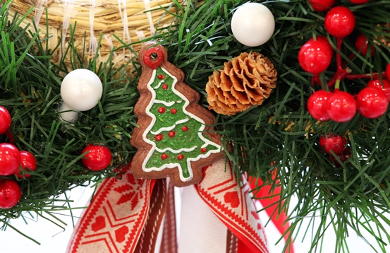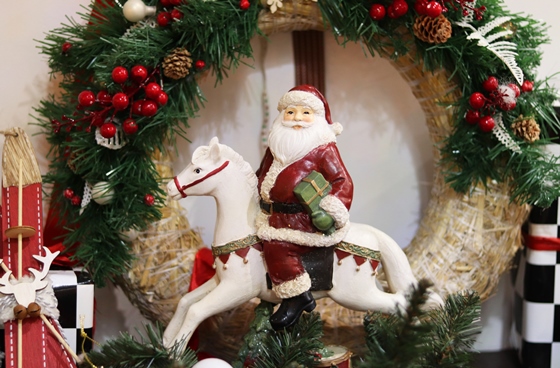 Праздничное оформление выдержано в стиле арт-деко: современные мотивы соединили с новогодней сказкой и белорусским орнаментом. В качестве декораций – украшения с шахматным рисунком и праздничные венки. Возле камина гостей встречает с подарками Щелкунчик.