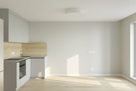 Студии получили название «Комфорт». Кухни-гостиные в них будут светлыми: пол покроют ламинатом с текстурой серого дуба, стены оклеят обоями с покраской в цвет патина, а потолок покрасят в белый цвет. На кухне установят мебель с немецкими фасадами, фурнитурой и столешницей. Из техники — холодильник, духовой шкаф, варочная панель и вытяжка. В комплект также входят мойка со смесителем.