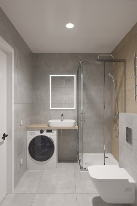 Санузел отделают плиткой под бетон и светлое дерево. Внутри будут душевая кабина, подвесной унитаз с инсталляцией, умывальник, столешница с тумбой и зеркало с подсветкой. Предусмотрены полотенцесушитель и стиральная машина.