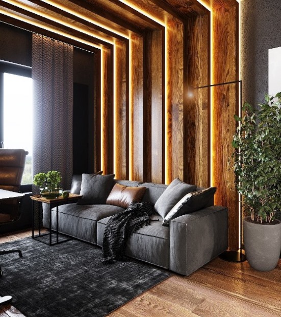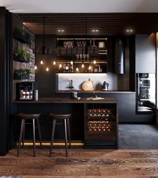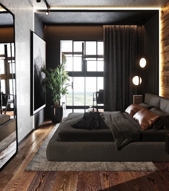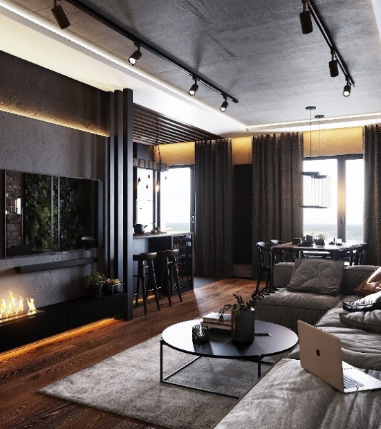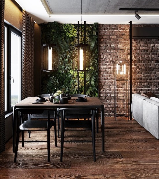 Открытое пространство, высокие потолки и большие окна — главные преимущества лофтов. Это наполняет помещение воздухом и светом. В интерьере использовали минимум перегородок и разделили пространство барной стойкой-островом, диваном и балками. Обеденную зону выделили фитостеной с подсветкой.