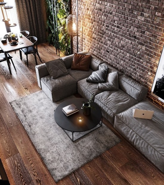 Основная палитра лофт-интерьера — натуральные цвета. В проекте дизайнеры использовали терракотовый акцент, который отлично подошел к цвету кирпича и дерева. Важной деталью лофта является освещение: люстры, подвесные лампы и напольные светильники.
