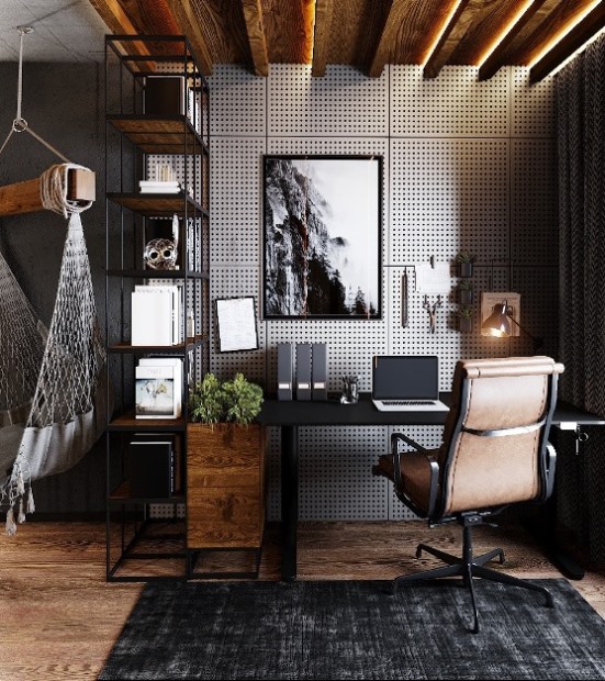 Мебель в интерьере простая и удобная: мягкий огромный диван, деревянные стулья, гамак, подвешенный к потолку в кабинете.
