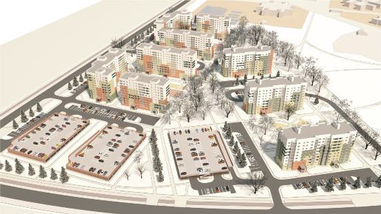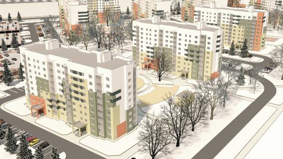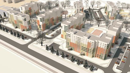 Архитектурно-планировочное решение предусматривает структуру застройки с учетом возможности применения жилых домов в изделиях индустриального исполнения в серии М464-У1М ОАО «МАПИД» (69,2%) и серии ОКПМ ОАО «МДК» (30,8%) этажностью 9-10 этажей, общей площадью 56 670 кв. метров.