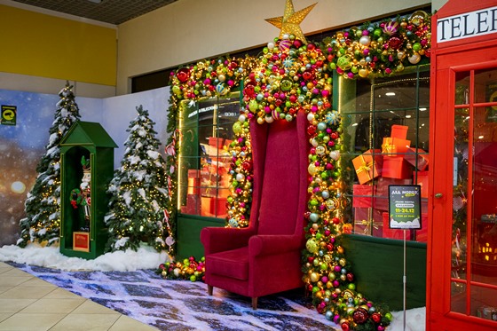 Резиденция находится на третьем этаже торгового центра. В центре волшебного поместья поставили трон, окружив елочными игрушками и увенчав светящейся звездой. Справа от него вытянулся «стражник» – сказочный королевский гвардеец, а слева стоит красная телефонная будка – точно такая же, как в центре Лондоне. На заднем фоне – витрины с подарочными коробками. Нашлось место и для наряженной елки с гирляндами.