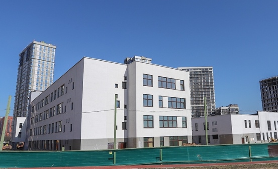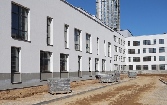 Здание разместилось на ул. Николы Теслы среди жилой застройки. Школа рассчитана на 1 050 учащихся и представляет собой 3–4-этажное строение сложной конфигурации. Фасад еще не покрашен, поэтому общий вид объекта пока не оценишь. А вот внутри картина более завершенная. Сегодня здесь идут отделочные работы, на некоторых блоках они уже фактически финишировали.