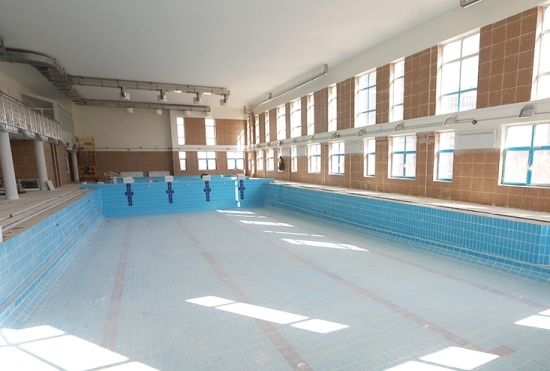 С него и начинаем знакомство с учебным заведением. Здесь уже завершены отделочные работы. Полностью готовы обе водные чаши — большая и малая. На козырьке-антресолях чуть позже установят более сотни зрительских сидений.