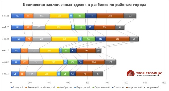 В этом году чаще всего квартиры покупали во Фрунзенском и Октябрьском районах города, немного отстает от них Московский район. Минимум сделок заключалось в Партизанском районе города.